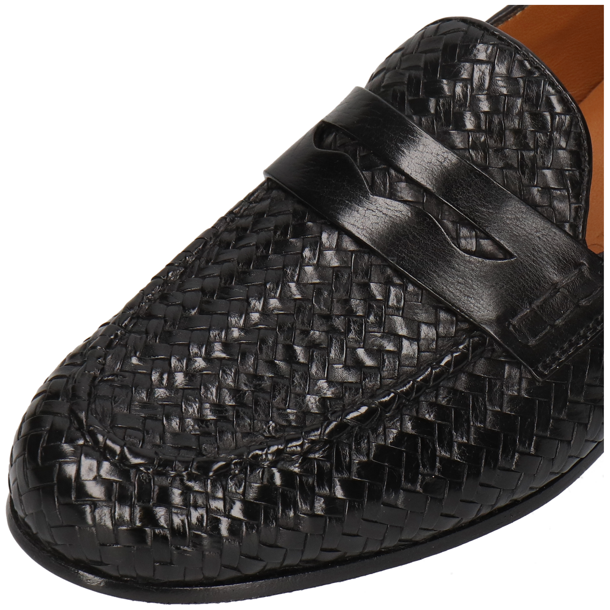 Glattleder und geflochtenes Leder: Pflege jedes Material separat. Wische die glatten Lederteile mit einem feuchten Tuch ab und trage anschließend eine Pflegemilch oder -creme auf. Für zusätzlichen Glanz kann Schuhcreme verwendet werden. Bürste die geflochtenen Bereiche vorsichtig und entferne überschüssige Creme aus den Zwischenräumen. Schuhspanner verwenden und die Schuhe trocken lagern. Nässe, Wachs, Fett und alkoholhaltige Sprays vermeiden.